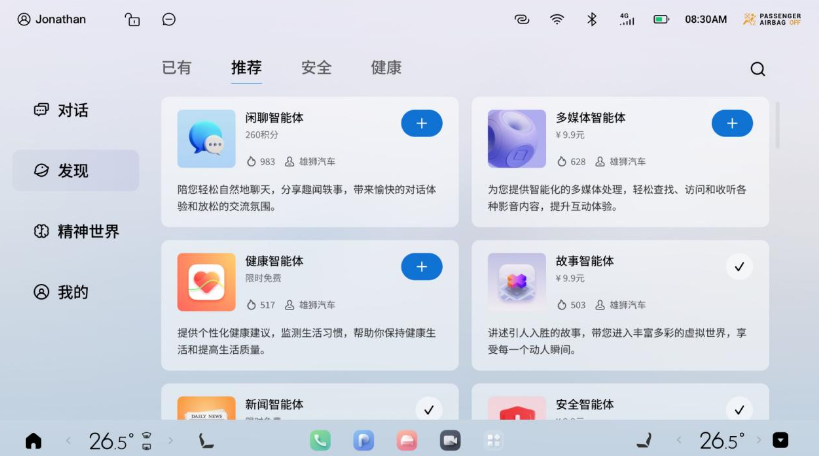 对于更广泛的8155平台用户,新增的Carlink功能提供了有线与无线两种连接方式,成功打破了手机与车机间的壁垒,实现了APP投屏、导航无缝流转等操作,让“手车一体”的无缝体验成为现实。此外,座舱的交互与娱乐体验也增添了更多情感与趣味。新增的语音VPA成人形象引入了成长机制,用户的每一次出行都能累积里程,解锁不同的成长技能,最终使VPA进化为更具陪伴感的成人形态,让出行不再孤单。而QQ音乐、无麦K歌等娱乐功能的完善,则进一步丰富了车内的休闲场景,让座舱变成一个移动的娱乐空间。